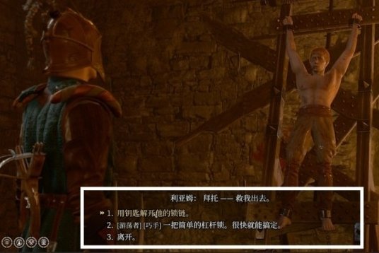 偷完后回来帮利亚姆解锁。放下利亚姆对话可以知道,地精想从他口中得知翠绿林地的具体位置。将他放走后,威尔在队伍中可获得激励点