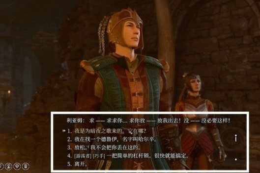 上前与利亚姆对话,选项12可以了解暗夜之歌和哈尔辛的任务细节,选3结束对话,选4游荡者职业直接开锁