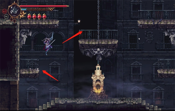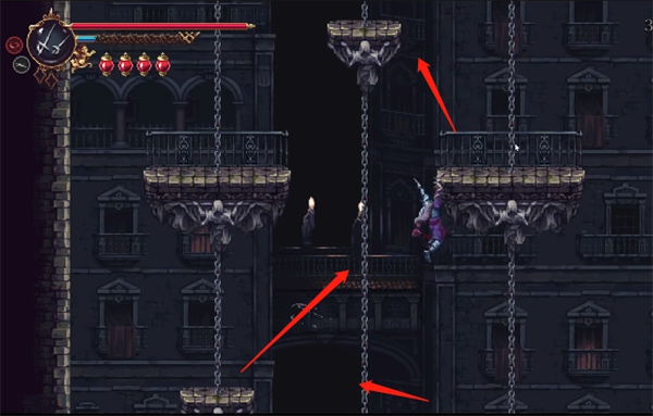传送到这里之后,借助石阶朝上跳跃。
