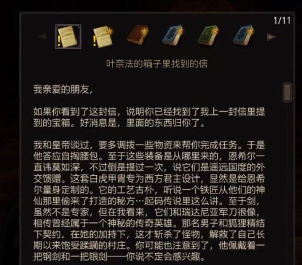 此外,玩家还能获得一封叶奈法的信,可以看到这些装备的来历。