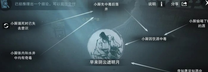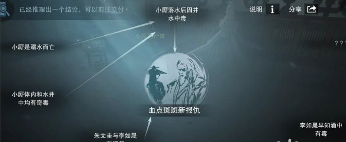 对话完毕,去调查小厮的尸体=2线索,水井=1