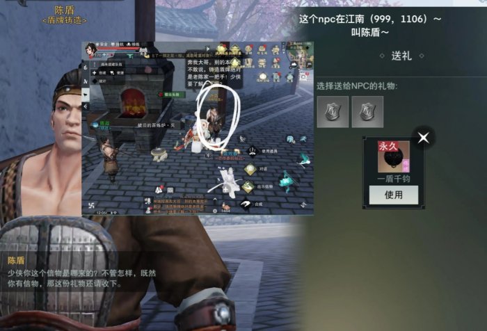 五、拿到盾牌后,来到江南,严州城,看下图饱饱,盾牌给npc后就get外观【一盾千钧】辣。