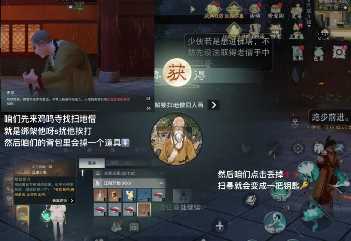 一、来到金陵(445,436)咱们先来找扫地僧~通过跟他切磋拿到道具【扫帚】,点击丢弃,【扫帚】就会变成佛塔的钥匙~