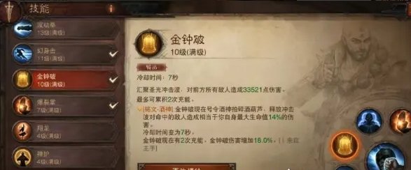 金钟破号令救生拍碎酒葫芦,释放范围冲击波对周围敌人造成伤害,是一个纯伤害技能,而且是最大生命值14%的伤害,两次充能,这个技能PVE和PVP都能用属于比较实在的技能,不是那种花里胡哨完全不能用的。