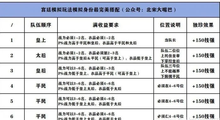 3、皇后放在3号位置,战力3~6名,衣品1~3名(衣品可高于皇上&太后)