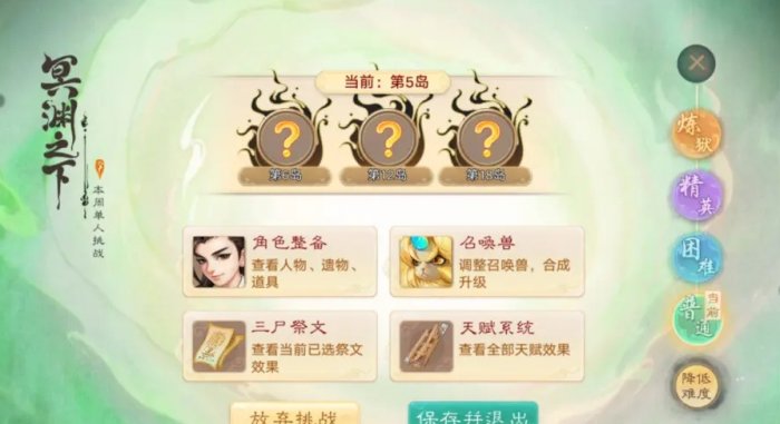 但其实,恢复岛是可以无限刷取符文的,在前往之前,我们先选择自己身上的古遗物进行禁用,进入恢复岛后,选择要替换的符文进行启用。我们如果没有成功刷取到自己想要的符文,可以点击保存并退出,重新进入冥渊之下。你会神奇的发现,变幻的次数又被重置了,可以重新再次刷取2次符文,通过该方式,我们就可以无限刷取符文,直至刷到你想要的符文为止。