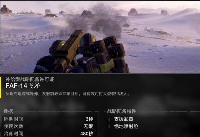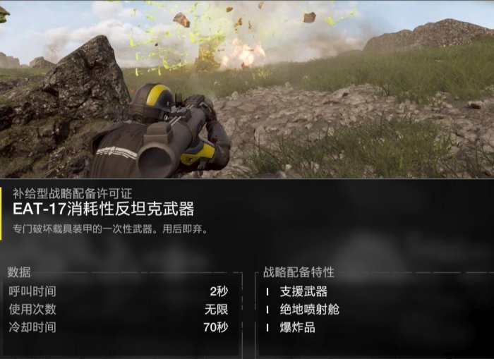 消耗性反坦克武器(次抛):通常拿来应急使用,CD短只有70秒,可以CD好了就扔,走一路扔一路。一次呼叫给两发一次性的反坦克筒子,身上每次可带一发(之前卡BUG可带两发,我不知道修没修)。一般作为反重甲的补充手段,缺点就是使用前有个开盖的前摇,很让人难受,机器人由于三个战备位的原因个人不推荐,打虫可以带。