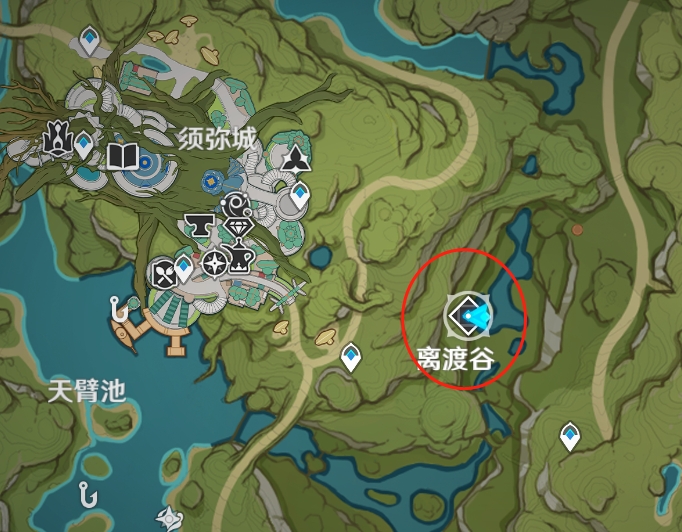 在须弥城的右下方的河谷里,我们直接传送到副本就可以了