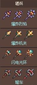 来自酒馆老板的各种哨兵(爆炸烈焰、爆炸机关、闪电光环、弩车)都有三种级别:魔杖、手杖、和法杖,其中法杖是最贵也最强大的。