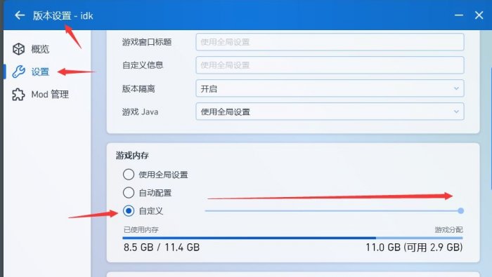 在主界面,点击版本设置,点击 设置,下滑找到 游戏内存板块,点击自定义,将自定义内存拉满然后返回主界面,点击启动游戏!!!