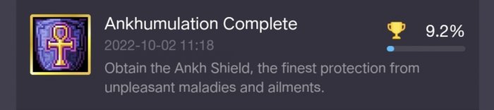 十字章护盾合成的复杂程度与恶心程度让泰拉瑞亚专门设置了一个成就来奖励合成了十字章护盾的玩家。