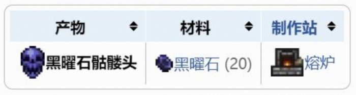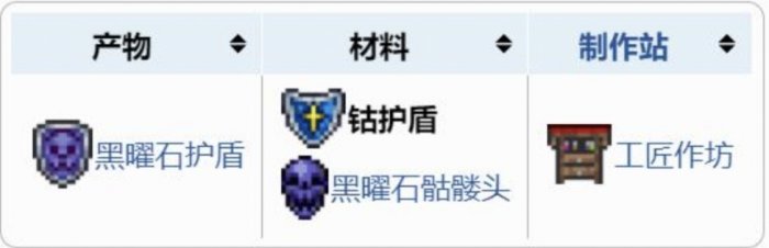 黑曜石护盾的合成较其他合成中的饰品来说更加简单,不需要刷怪只用探索挖矿就能合成,由黑曜石骷髅头和钴盾合成。