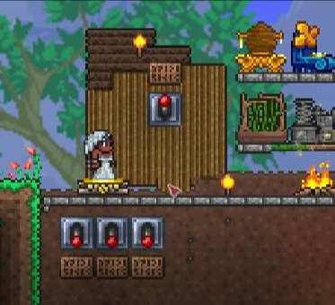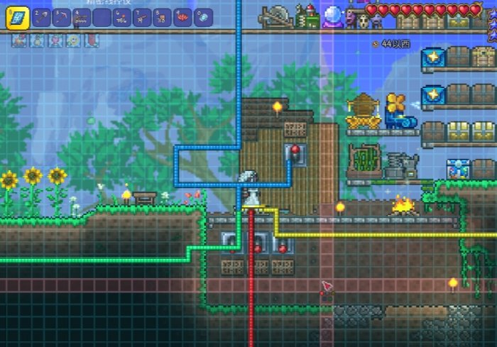 首先,先在一个合适的位置放置平台,然后放置一个传送机,在传送机附近铺上背景墙;