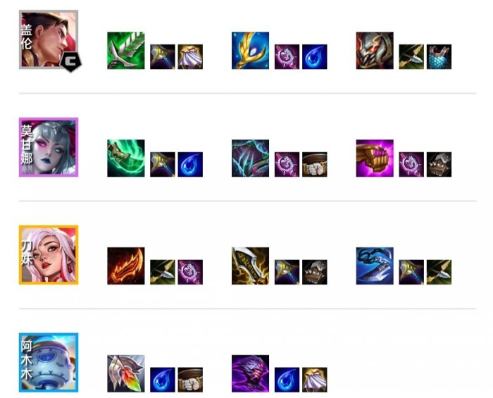 其他可选:护卫之徽、护卫之冕,提升阵容上限。珠光莲花,让技能可以暴击,增强盖伦输出。治疗法球、药剂师,增强阵容的续航回复能力。