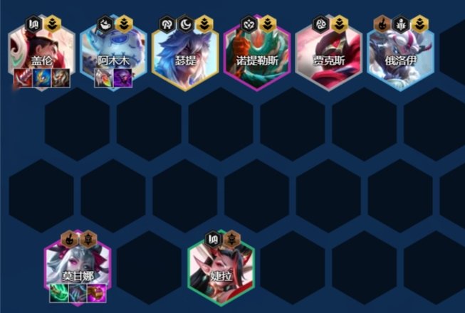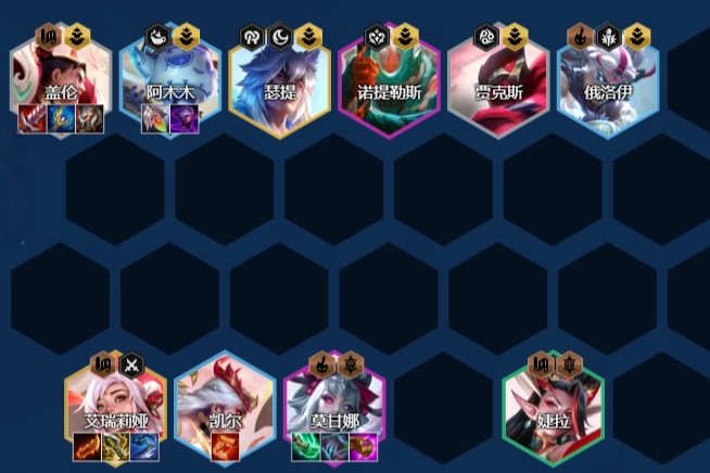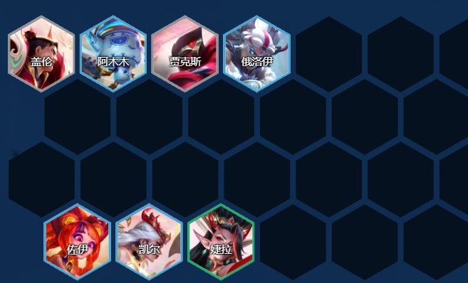 必备传奇英雄,提供一个两星盖伦,盖伦技能会提供可叠加的最大生命值,如果最大生命值高于目标,他的技能会额外造成50%真实伤害。