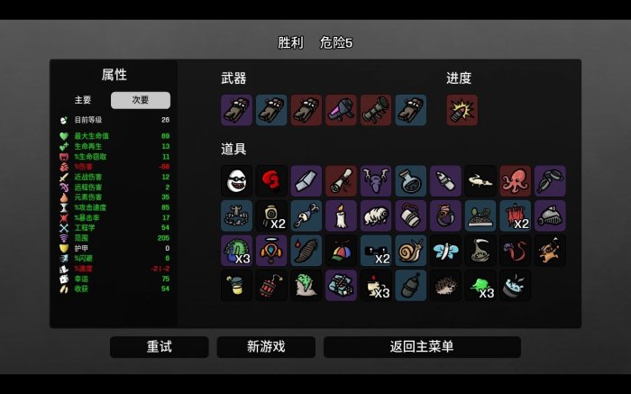 这个职业,猛猛加爆炸范围和爆炸伤害就行伤害很高,其次就是元素伤害(优先)和远程伤害,攻速,范围这些道具也可以拿,拿些+伤害的道具也行,让他减伤害的少减点但是-100肯定不可能弄到0,如果能拿到核弹发射器基本就是通关没问题了