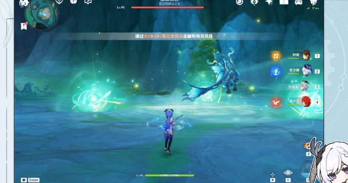3.稍等一会,BOSS就会处于风属性附着(有文字提示),用冰/火元素攻击周围的3个风球就行了