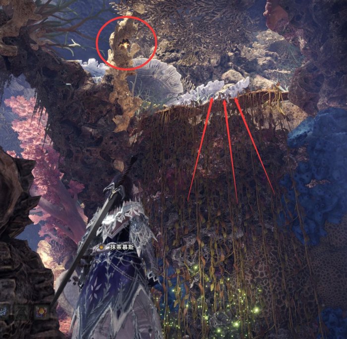 这里可以看到很长的一条藤蔓,红框处有一只楔虫,按下瞄准键,会有按键提示,按下鼠标右键可以发射钩爪拉上去,化身新大陆蜘蛛侠。