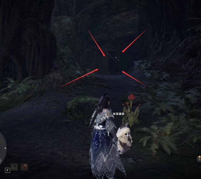 走到毒妖鸟巢穴处,继续往前会看到分叉路,走右边那条,参照物是飞砾果实和毒蔓草。