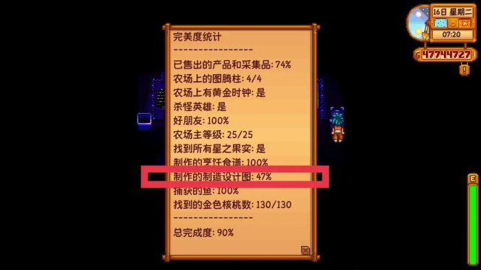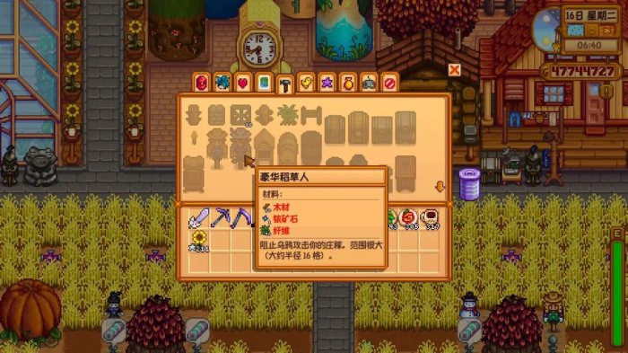 但其实这豪华稻草人用处不是很大,因为在这个时候你的稻草人已经放置成型,也没必要造豪华稻草人去替代,除非你想省几个格子来种作物,但感觉没什么必要,省的这几个格子都不够材料钱的,这个豪华稻草人的主要用途就是获得这份配方并制作一个出来,因为这是100%完美度的其中一项指标,重要也就重要在这里了