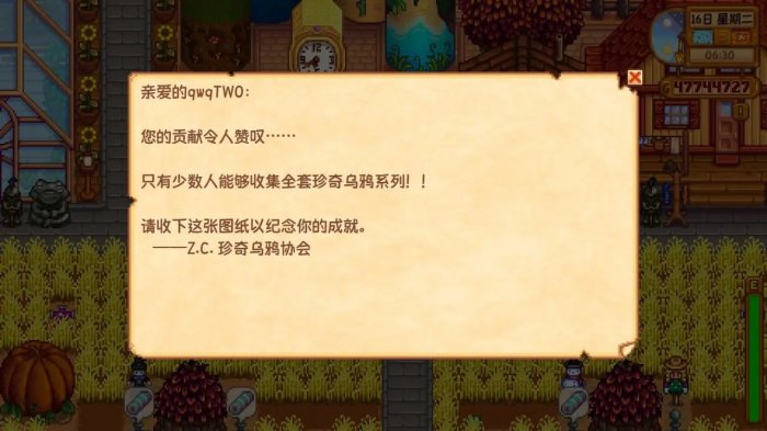 当你集齐所有的稀有稻草人后,你会收到Z.C.珍奇乌鸦协会寄给你的一封信(这个乌鸦协会游戏中没有过多提示,或许是未来的更新内容也说不准)