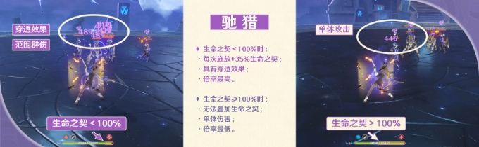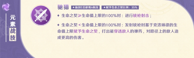 驰猎是铳枪射击,是克洛琳德叠加生命之契的主要手段之一,在生命之契<100%时,每次施放驰猎都会叠加35%的生命之契,且具有穿透群伤效果,伤害倍率在驰猎中也是最高的。