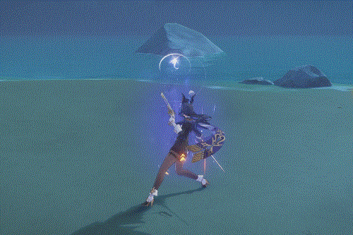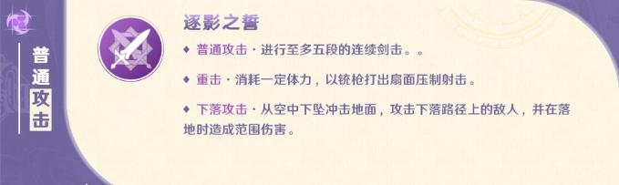 下落攻击同理其余单手剑武器角色,处于半空或高空时施放A就可触发下落攻击。实战中也不常用。