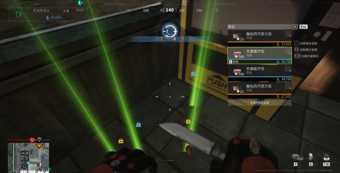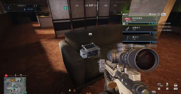 两层楼中有多个房间,除了一楼有个钥匙房间外,还可以在健身包、军备箱、机箱等箱包中搜集物资。
