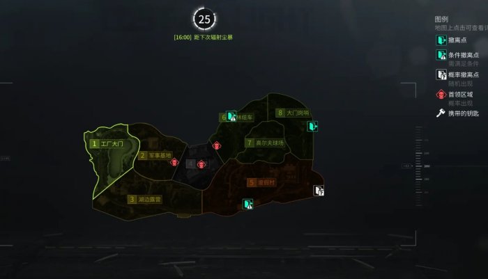 全场共有7个撤离点、3个高级资源点、5个火金刷新点和?个自动售卖机,危险等级中等,物资不足,收益等级较低。
