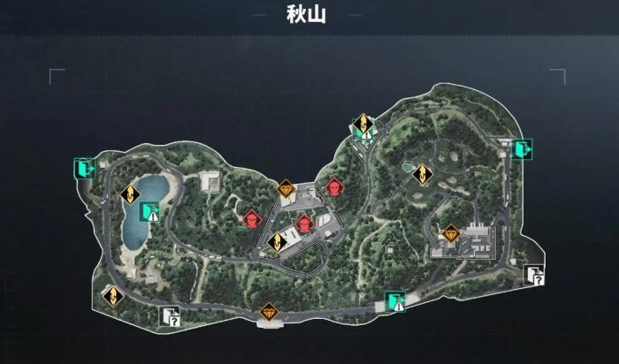 秋山主要由八部分组成,分别是最西侧的1号区域【工厂大门】、西侧的2号区域【军事基地】、西南侧的3号区域【湖边露营】、中央的4号区域【别墅区】、东南侧的5号区域【度假村】、别墅东北侧的6号区域森林缆车、东侧的7号区域【高尔夫球场】以及地图东北侧的8号区域【大门岗哨】。玩家可以在1-3号、5-8号出生点之间自由选择,其中2号、4号、6号区域均有概率刷新BOSS怪。