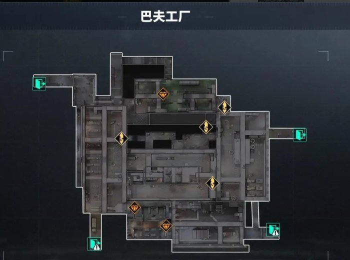 巴夫工厂主要由五部分组成,分别是南侧的1号区域【卸货区】、中央的2号区域【地下室】、西侧的3号区域【原材料区】、东侧的4号区域【废弃机床】和北侧的5号区域废水池。玩家可以在1号、3号、4号、5号出生点之间自由选择。