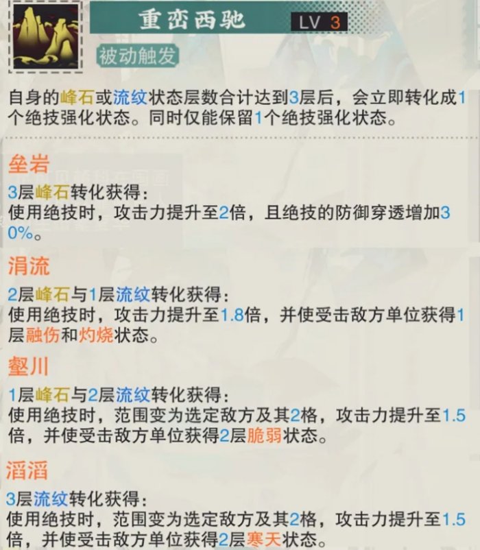 接着我们来看其核心被动【重峦西驰】,累积3个普攻/职业技能buff后即可得到四选一的大招强化效果,我们依然假设普攻buff为A,职业技能buff为B,那么就是AAA(垒岩)、AAB(涓流)、ABB(壑川)和BBB(滔滔)四个组合,待会就用这个表达方式了,大家自行对照一下即可。接着就是每一个强化大招效果的详细分析,首先第一个是强调直接输出的AAA增益大招: