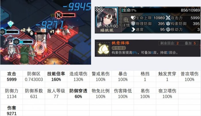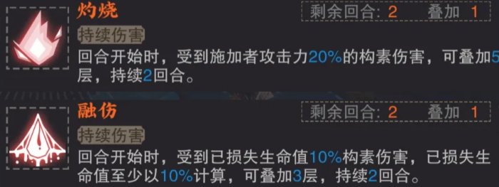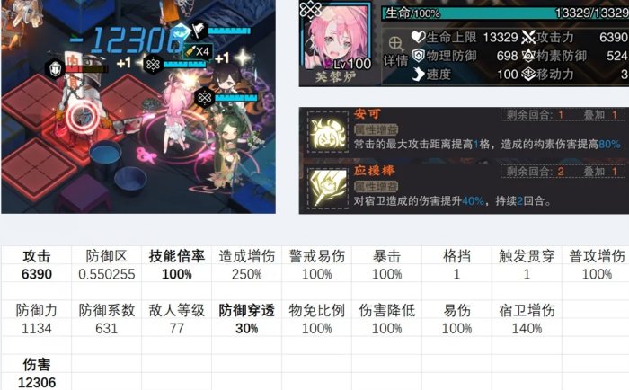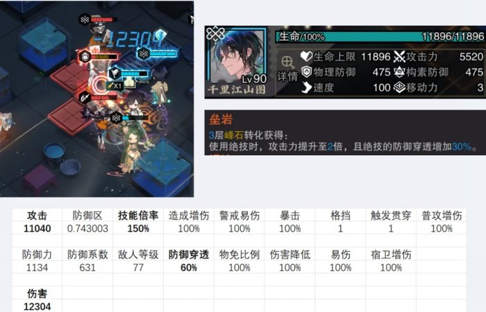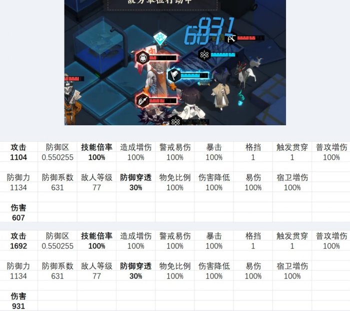 同样的测试环境,如果换位AAB增益大招的话,直接伤害会从AAA的12304点降至8201点,针对这个77级1134防御力的宿卫敌人而言,AAB的直接伤害大概就是AAA的2/3,这个数据大招参考一下,不过敌人却会被施加“灼烧”和“融伤”两个debuff效果,