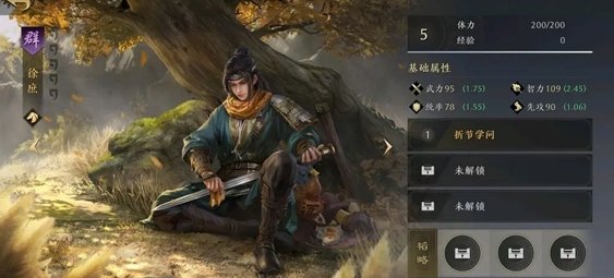 4、【鲁肃】:在特定阵容[孙权、鲁肃、郭嘉]中有R0强度。有一定的减伤作用,搭配缴械能够有相当多的增益。
