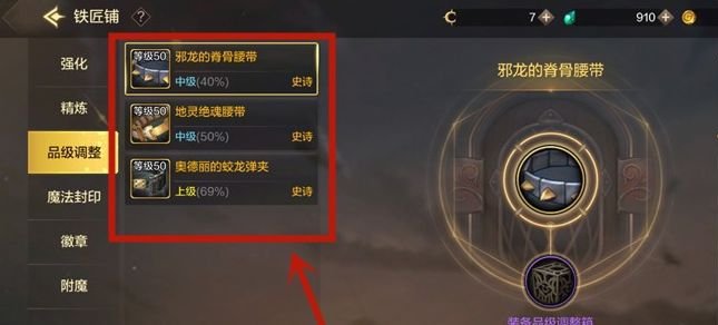 3、在里面看到自己可以调整品级的装备,点击一个选中。