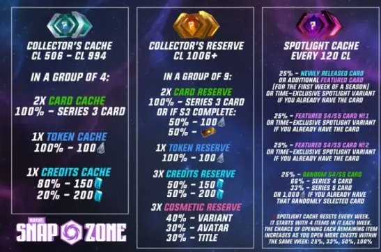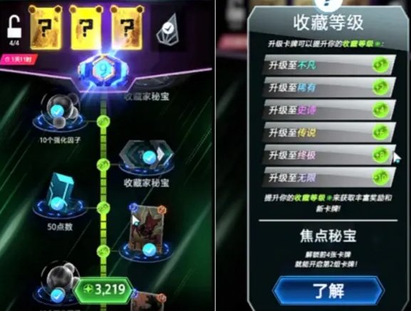 终极逆转有着与其他卡牌游戏完全不同的一套集卡系统:通过提升你的收藏等级来开取收藏树上的奖励,而所有的卡牌都在树上。换言之,你完全可以通过白嫖的方式来获取所有的卡牌!收藏树也分为三个阶段:1- 214级为1池,222-474级为2池,486级往后为3池。对应池子只能开到相应池子的卡牌,且完全随机。而到500级以后收藏树还会解锁紫箱子系统,每120级能获取一个开箱钥匙,紫箱子一周更新一次,一轮为4箱,由3张特定4、5池卡及一张随机4、5池卡组成,你可以根据自己的卡池来决定是开箱还是继续积攒钥匙。