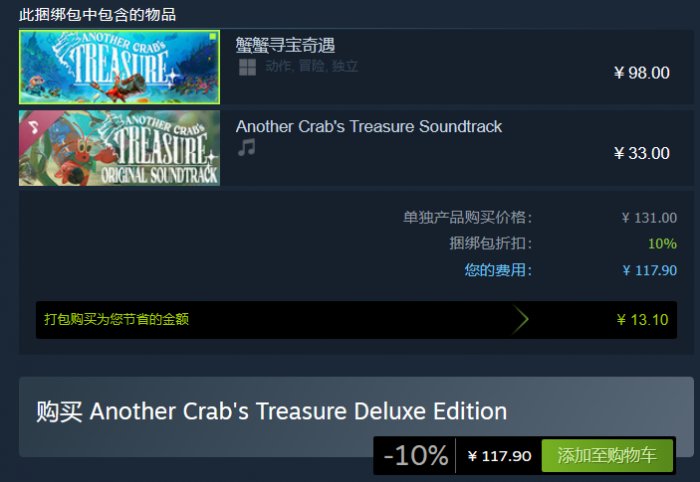 2、Another Crab's Treasure Deluxe Edition9折后价格117.9元,除游戏本体外还包含数字原声带。
