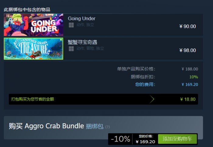 3、Aggro Crab Bundle捆绑包除了游戏本体之外还包含游戏〔Going Under〕,折后价169.2元。
