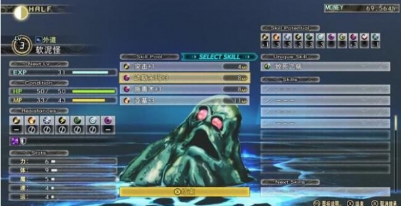 2.如下图选择的阴摩罗鬼作为副材料,软泥怪作为主材料可以获得新的技能“亚基”,但由于软泥怪本身弱火,且火系技能的熟练度较低,导致最终获得的“亚基”为“-3级别”。