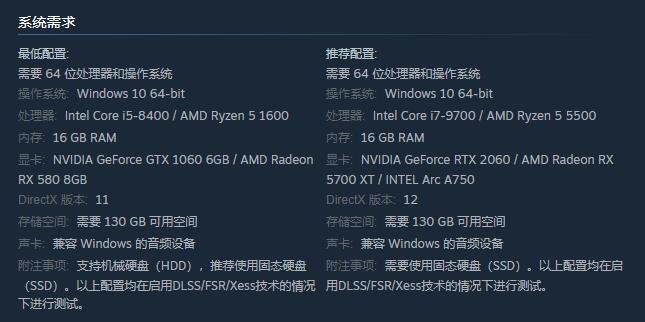 附注事项: 需要使用固态硬盘(SSD)。以上配置均在启用DLSS/FSR/Xess技术的情况下进行测试。