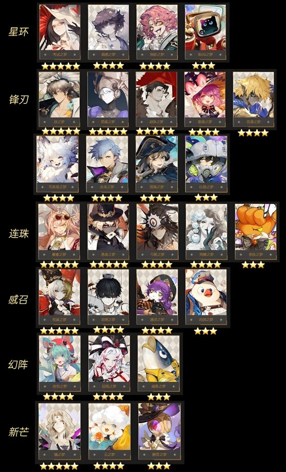 1、星环流派:代表梦灵——考试之梦、拖延之梦,擅长环身流战术;
