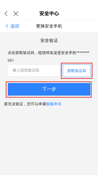 6.在更换绑定之前,需要使用绑定的手机号码接收短信验证码进行验证,如果无法验证,点击【客服申诉】进行申述;