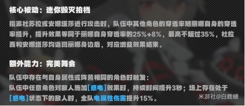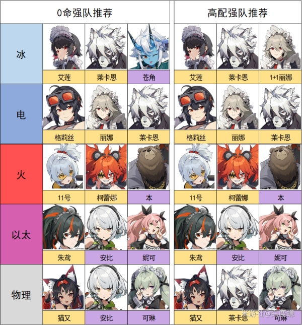 最优解是3S——格莉丝、丽娜、莱卡恩。缺人的话只能单挂本,不能带安比,同属性会中和异常伤害。