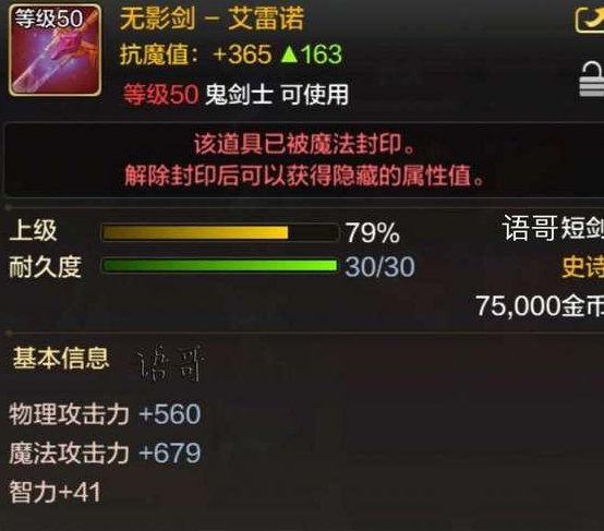 无影剑-艾雷诺可以直接提升30%的攻击力,而且面板属性附加魔法攻击力和智力属性,对于鬼泣来说也是完美契合的。