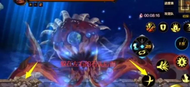 【应对方法】跑到左上角或右上角,躲在石头后面即可,这个机制会持续一段时间,不要着急去输出。