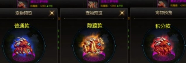 宠物礼盒中有5%几率开出“隐藏款宠物”,隐藏款、普通款、积分商城款这3种宠物的属性都是一样的,唯一的区别就是外观不同。