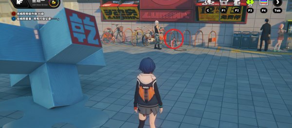 传送到报刊亭,向左后方看,调查最右边的自行车即可