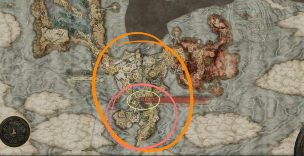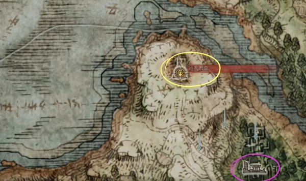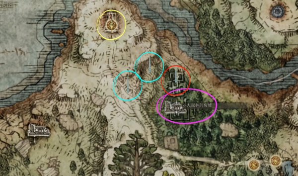 1、传送到息宁姆格福-啜泣半岛区域的“巡礼教堂”赐福点,右下方就是“亚人森林的废墟”