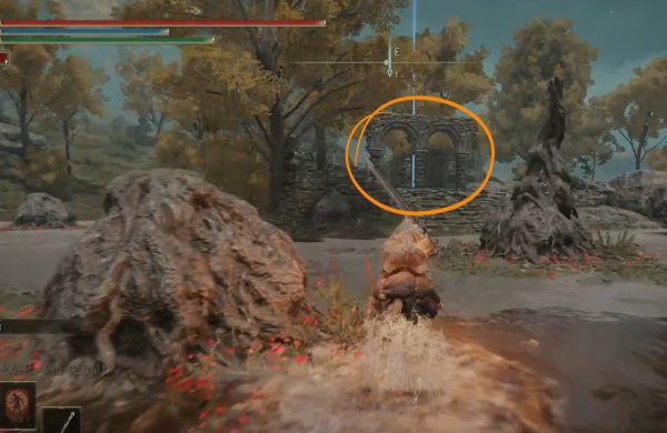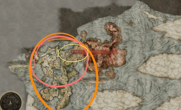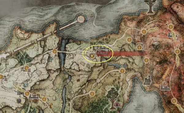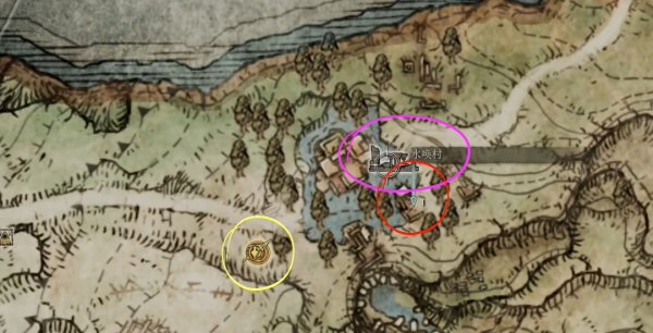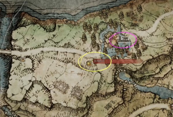 1、传送到“宁姆格福(北)”区域的“水唤村外”赐福点,目标地点就是右上方不远处的“水唤村”,可以参考我来标记“1号标记点