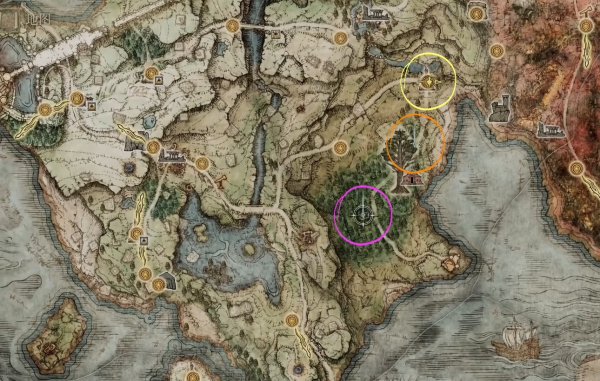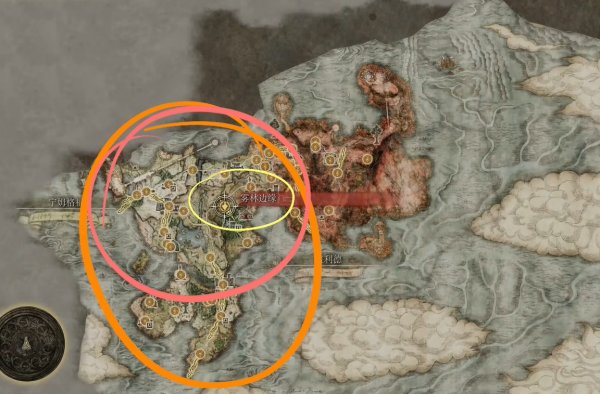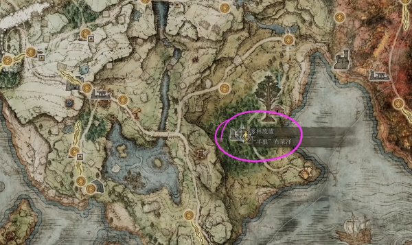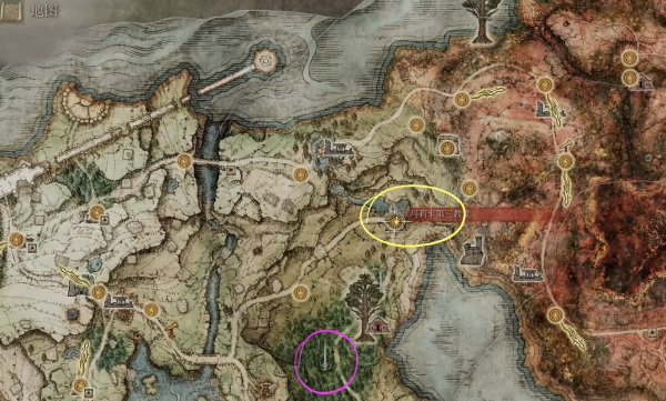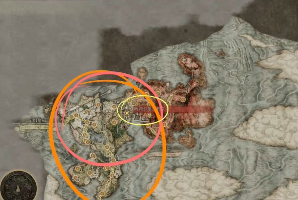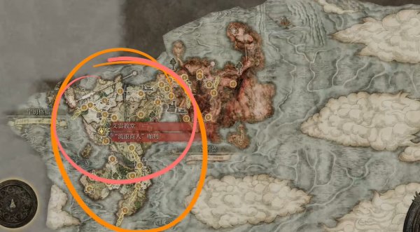 1、传送到“宁姆格福(北)”区域的“玛莉卡第三教堂”赐福点,目标地点就在左下方的“1号标记点”位置